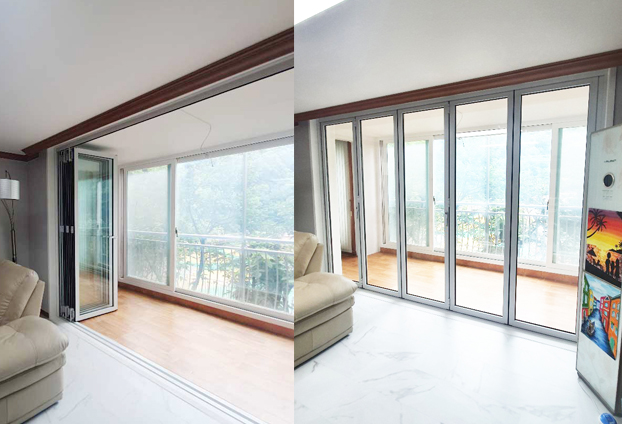 이런 하부레일 시공방식으로 기존 샷시틀 철거하지 않기 때문에 추가로 철거 비용이 발생하지 않으며, 이미 인테리어 시공이 되어있는 도배, 장판, 대리석 등에 손상됨이 없습니다. 철거작업이 필요없는 시공방법으로 폴딩도어 설치 작업 시간이 빠르게 진행되며 이 시공 방식을 "원데이시공방법" 이라고도 합니다.
