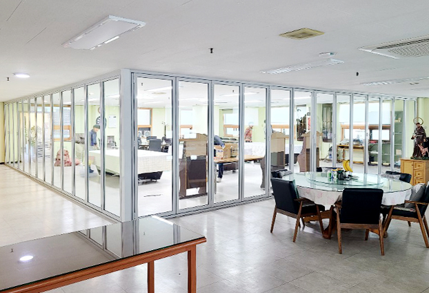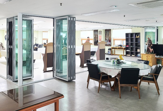 요즘 성당에는 미사뿐만 아니라 여러 공간들을 꾸미곤 합니다. 수원성당에서는 예배가 끝난 후 삼삼 오오 모여 커피 한잔의 여유와 담소를 즐기거나 친목을 위한 공간에 폴딩도어를 설치하였습니다. 평소에는 확장하여 넓은 공간으로 사용하고, 미사가 있는 날에는 폴딩도어를 닫아 독립적인 공간으로 사용합니다.