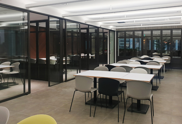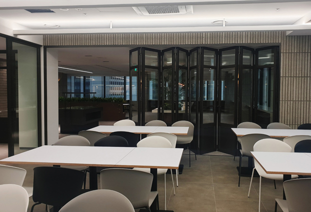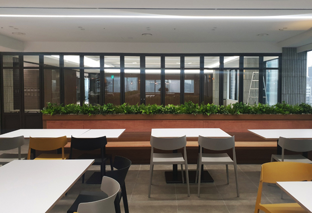 하루에 정해진 인원수가 방문하는 곳이 아니기에 구내식당 실내 공간에도 폴딩도어를 설치하여, 방문한 인원수에 맞게 접었다 폈다 하여 공간을 확장할수 있습니다.