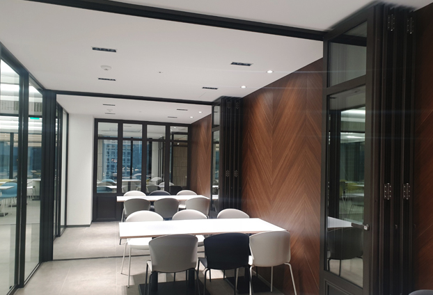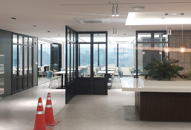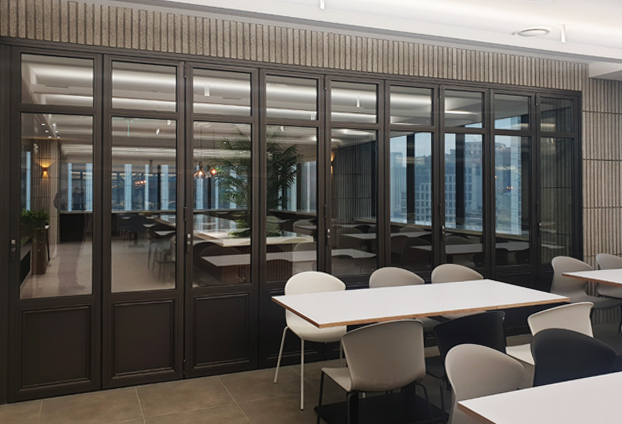 이번 구내식당 시공현장에는 폴딩도어 뿐만 아니라 픽스도어도 설치가 되었습니다. 공간 확장과 분리이 가능한 폴딩도어 54장과 공간 분리가 가능한 픽스창 22장으로 총 76장이 시공 되었습니다.