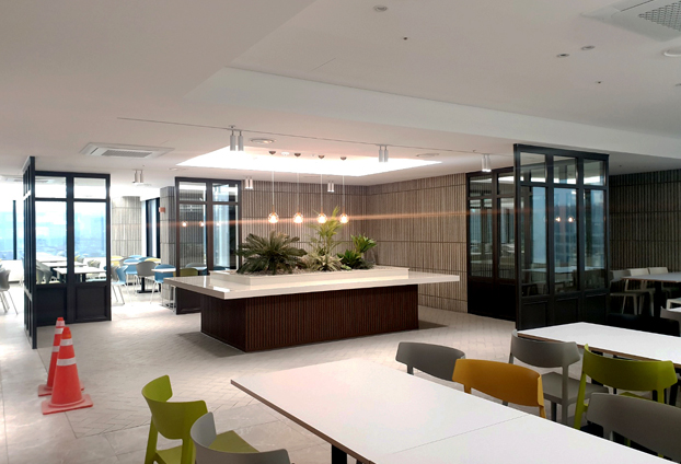 구내식당 특성상 음식은 뷔페 형식으로 되어있으며, 1인 1판의 식판을 사용하여, 먹을만큼 담아 식사를 합니다. 맛있는 음식을 식판에 담아 도란도란 앉아 즐거운 식사을 즐길수 있는 공간입니다. 많은 인원이 방문하지 않았을 때는 폴딩도어를 접어 공간을 분리하여, 넓은 공간 모두를 사용할 필요가 없습니다.