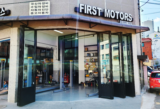 스펜달 폴딩도어를 카센터에 설치를 하여 투명창이 하부레일까지 내려오는 일반 폴딩도어와 다르게 작업시 지져분해질수 있는 바닥 일부분을 가릴수 있는 가림막으로 활용될수 있는 점 입니다. 차량을 수리하며 매번 지져분해진 바닥 부분을 청소를 하여 깔끔함을 유지하면 좋겠지만, 작업량이 많을 시에는 어려운 부분입니다.