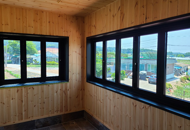 원목과 잘 어울리는 블랙 색상의 프레임과 블루+투명 16T 복층유리로 진행하였습니다.