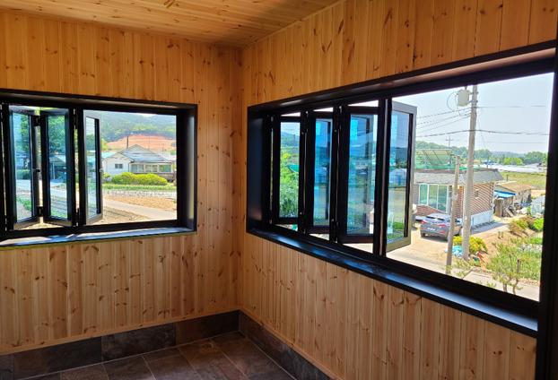 신축 개인주택입 2층에 창문형 폴딩도어를 시공 하였습니다. 앞쪽과 옆쪽 2곳 모두 폴딩도어를 설치하여 넓은 개방감으로 야외 풍경을 감상할수 있습니다. 또한 반자동구동으로 손쉽게 여닫음이 가능하며, 실내 창이 아닌 외부 창으로 설치된 폴딩도어로 일반 창문형 폴딩도어 하부레일과 다르게 외부격납방식의 하부레일을 시공하여, 비 내리는 날 실내로 빗물이 유입됨을 차단 하였습니다.