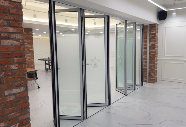 내부 폴딩도어는 모두 기본 화이트 색상 프레임으로 진행하였으며, 8짝의 문로 양개형(2way) 시공방식 / 3짝의 문과 1짝의 흰지도어로 편개형(1way) 시공방식으로 진행하였습니다.