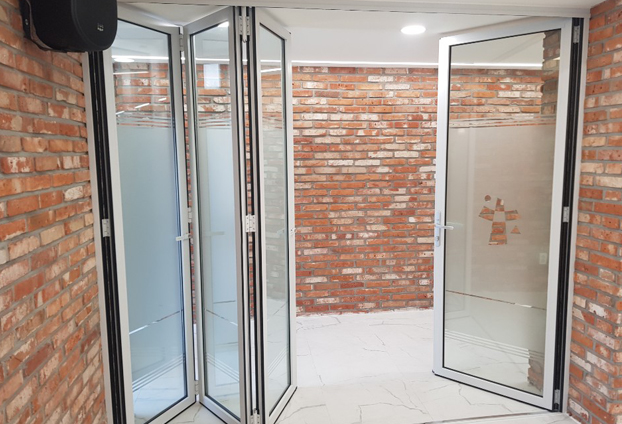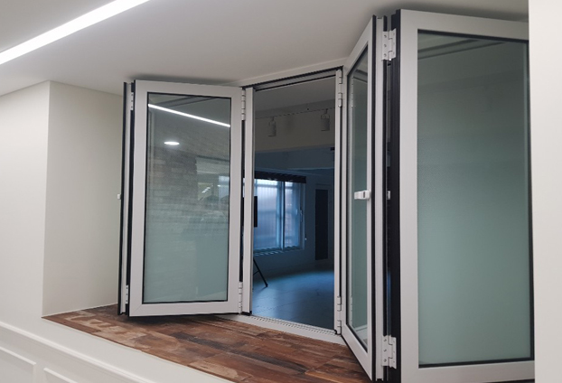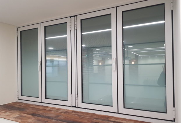 창문형 폴딩도어로 총 4짝 양개형(2way) 시공방식으로 시공하였습니다. 유리는 후가공을 시트지 작업을 하였습니다.