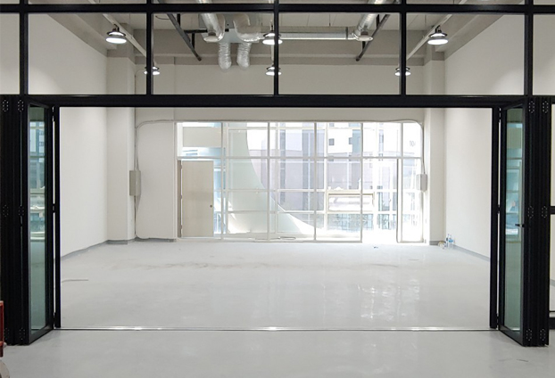 큰 물건과 기계가 통행해야하기에 개폐율 90%인 폴딩도어를 설치하여 통행에 자유로움을 주었습니다.