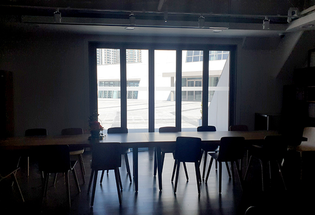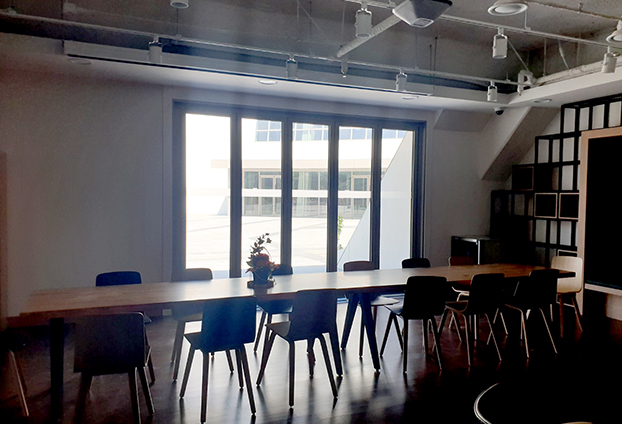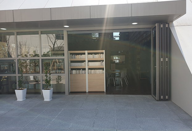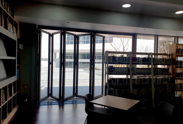 1층에 위치한 북카페로 야외에 있다가 바로 북카페로 들어갈수 있게 폴딩도어를 2곳으로 나누어 5짝씩 총 10짝의 폴딩도어를 시공하였습니다.