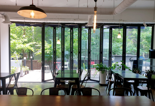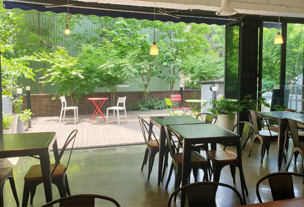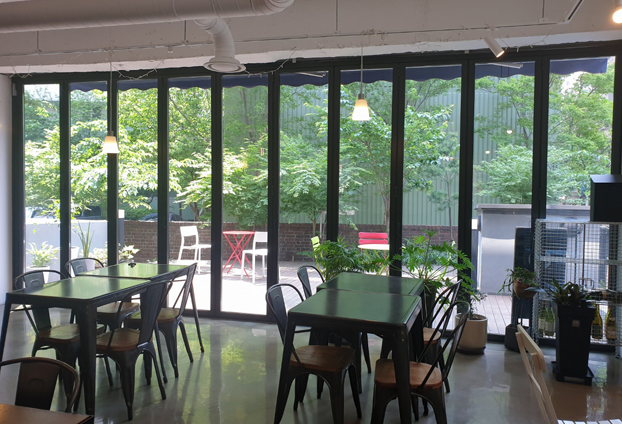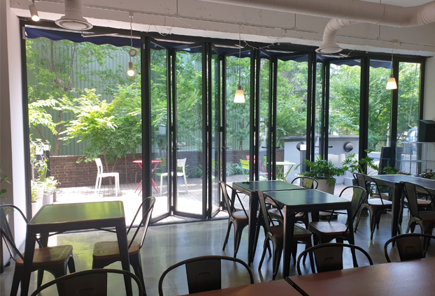 실내 안에서 바라보는 풍경 또한 폴딩도어 사이로 커피와 잘 어울리는 고급스럽고 세련된 분위기를 연출합니다.