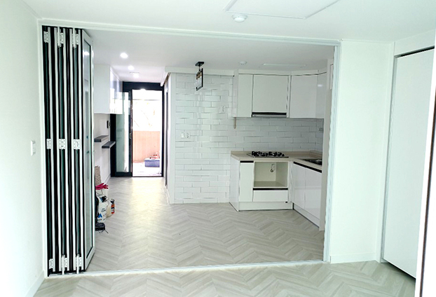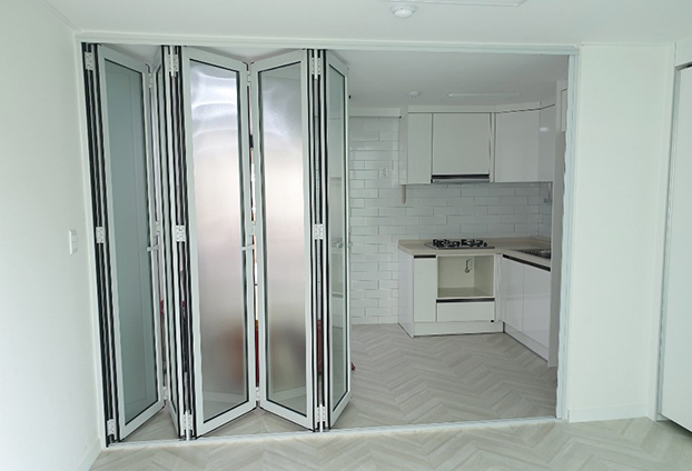 집 인테리어와 잘 어울리는 기본 화이트 색상으로 총 5개의 문으로 편개형(1way)로 시공하였습니다.