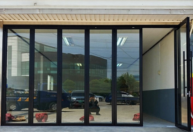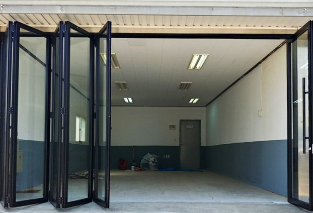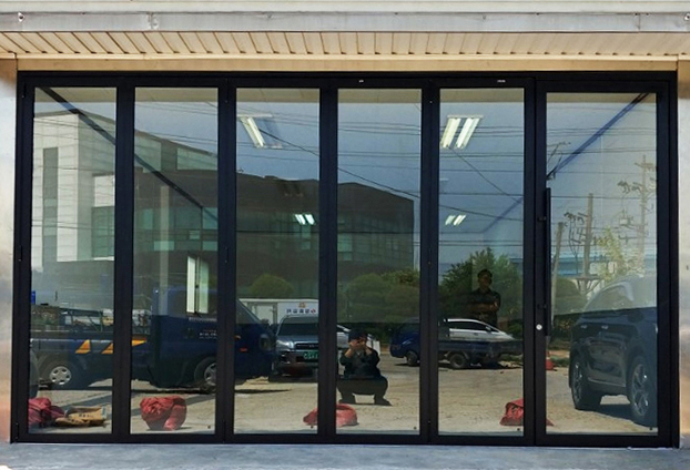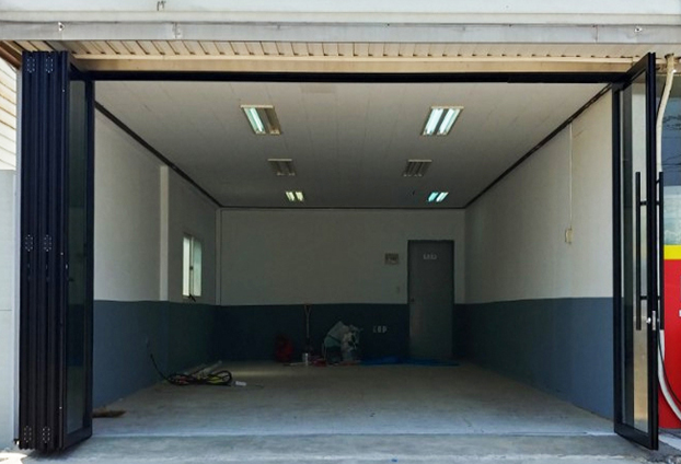 다른 카센터들에 비해 아담한 카센터로 문 5짝과 힌지도어 1짝으로 시공하였습니다. 힌지 도어는 사람이 출입 할수 있는 출입문 역할을 하는 도어로써 180도 회전하는 도어이며, 폴딩도어와 호환이 되어 폴딩도어와 출입문 개폐시 전체적인 개퍠가 가능한 출입문이며 시건장치가 가능합니다.