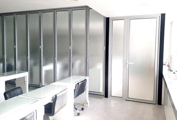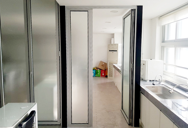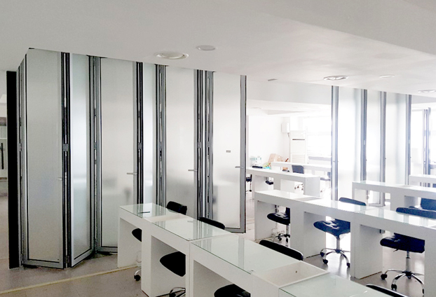 공간이 넓어 한쪽으로 여닫는 편개형(1way)로 여닫기보다는 양쪽으로 여닫는 양개형(2way)로 여닫는 것이 활용도도 많고, 손쉽게 여닫을수 있기에 양개형으로 시공을 진행하였고, 폴딩도어를 모두 닫고, 수업을 진행해도, 수업에 방해되지 않게 출입이 가능할수 있도록 1개의 시스템 도어를 설치 하였습니다.
