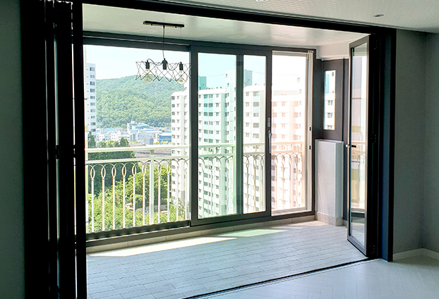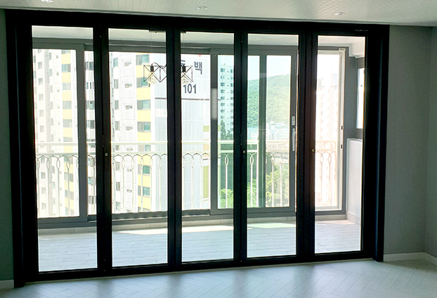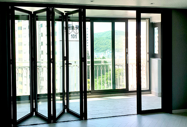 5짝 + 1짝으로 총 6짝의 폴딩도어로 1짝만 열고 닫고 하여 문처럼 사용할수 있으며 전체적으로 접었다 폈다 양개형으로 확장하여 공간 활용이 가능합니다.
