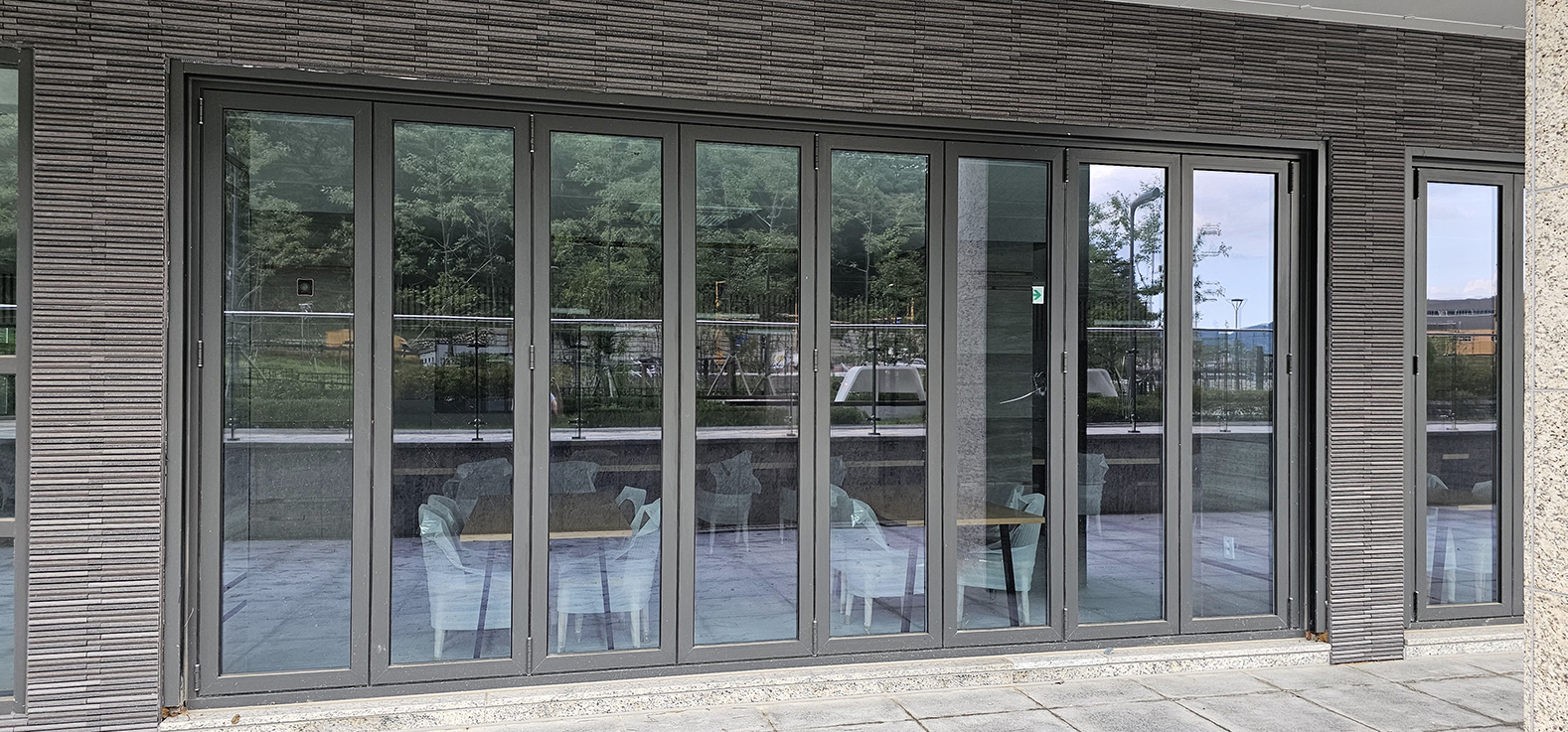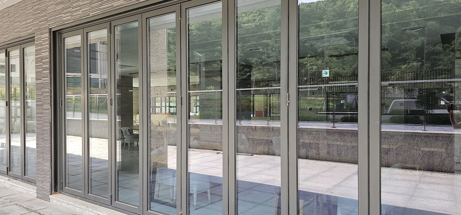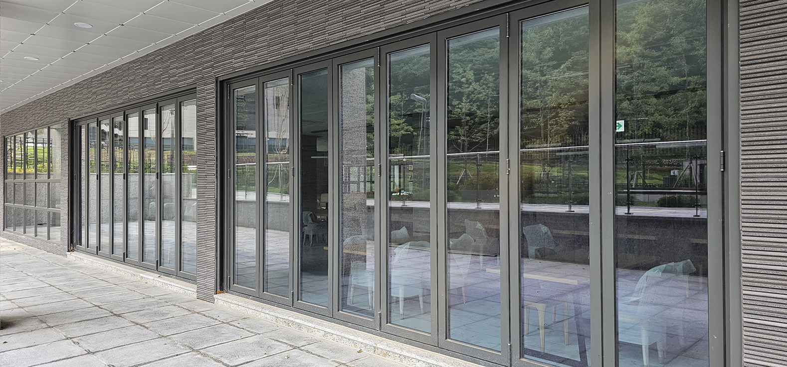 아파트 커뮤니티 시설에 엠버 그레이 컬러(지정색상)의 단열폴딩도어를 설치하였습니다. 입주민 공용 시설로 주민들이 커피를 마시며 휴식을 취할 수 있는 라운지 카페입니다. 휴게공간에 사용되는 폴딩도어는 공간 활용을 극대화하고 시각적으로 개방감을 주는 데 큰 역할을 합니다. 필요에 따라 폴딩도어를 열거나 닫을 수 있어 공간 활용에 유리하며 현대적이고 매력적인 공간을 완성해 줍니다.