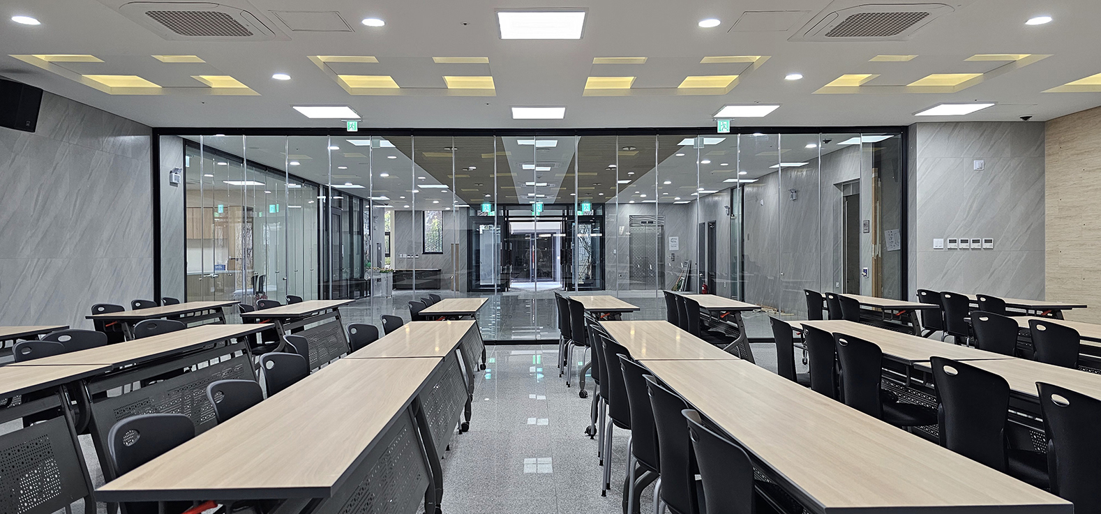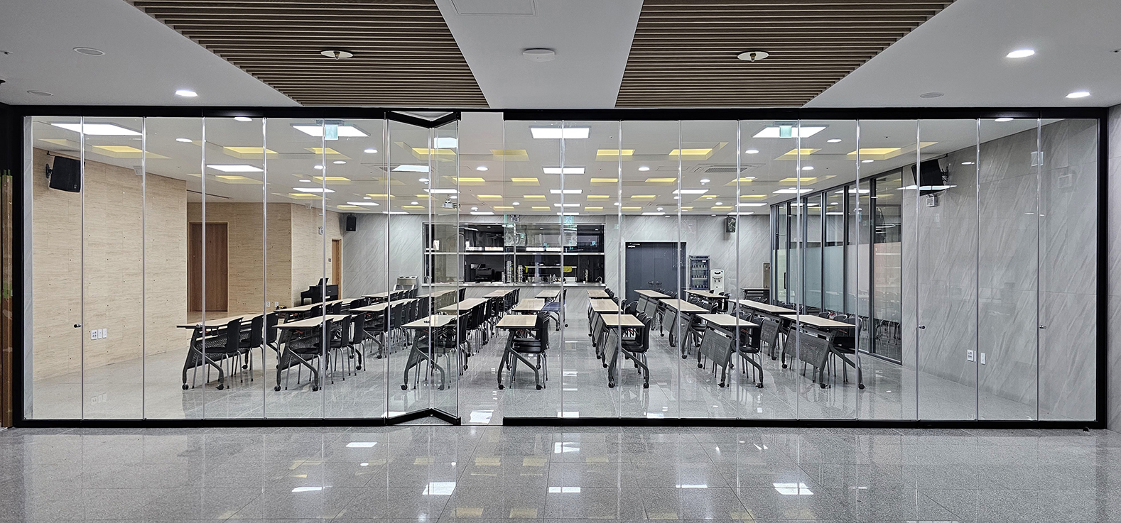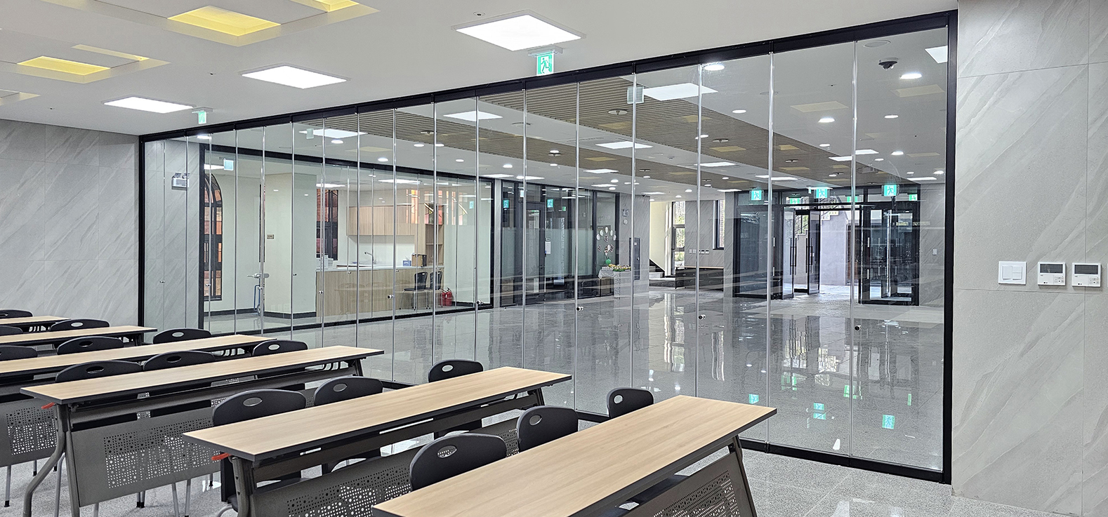 이 글라스폴딩도어는 투명하게 내부가 보이기 때문에, 문을 열지 않고도 외부에서 쉽게 확인할 수 있어 많은 사람들이 이용하는 공간에서도 불편함 없이 원활한 동선과 시각적 개방감을 제공합니다. 미사실과 교육실의 분위기와 잘 어울리는 디자인으로, 기능성은 물론 미적인 측면에서도 훌륭한 선택이 되었습니다.
