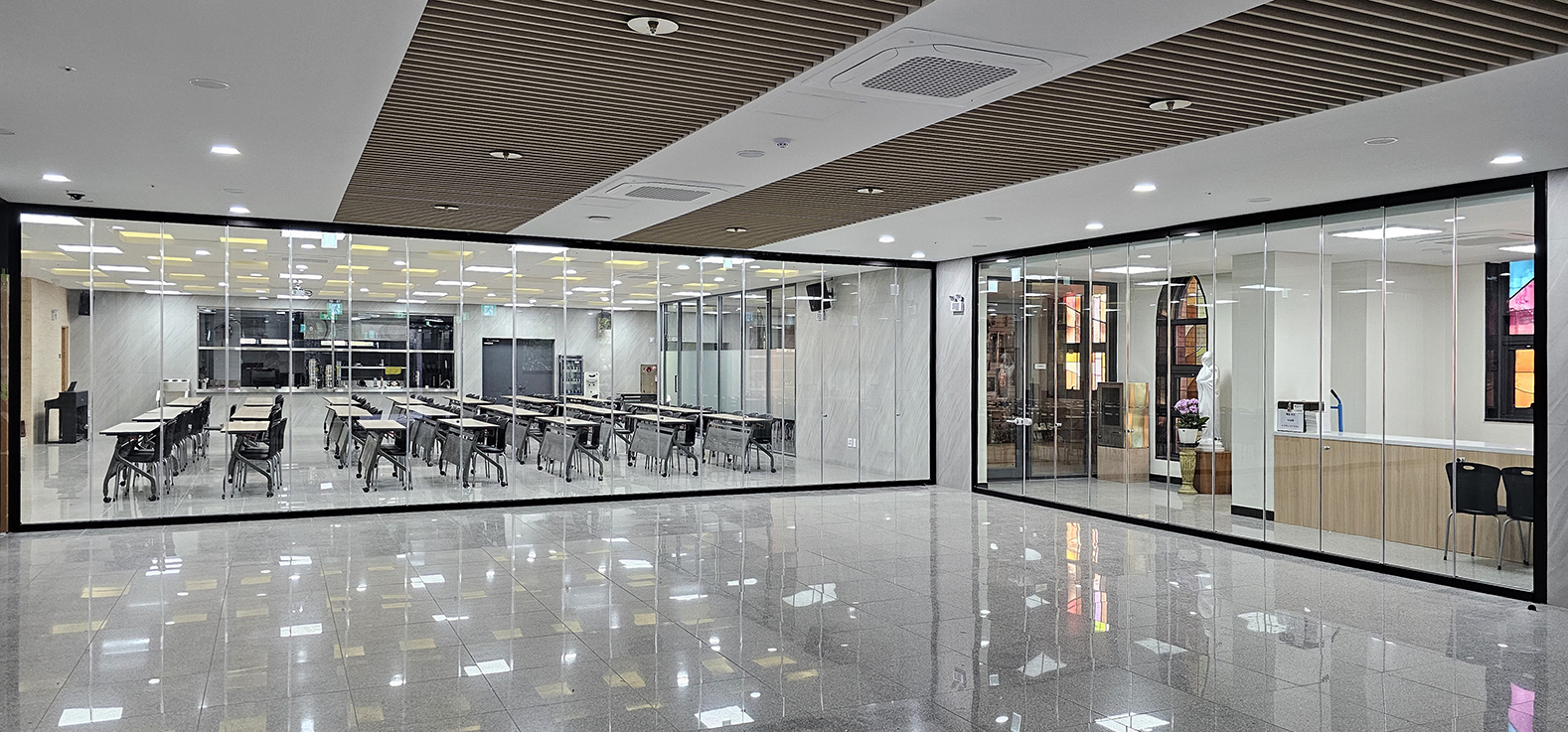 성당의 미사실과 교육실에 설치된 블랙 프레임의 글라스폴딩도어는 공간에 세련된 분위기를 더하며, 대리석과 유리의 조화로 밝고 깨끗한 느낌을 주는 아름다운 인테리어를 완성하였습니다. 대리석과 유리의 재질이 반사된 빛에 의해 공간이 더욱 넓고 환하게 보이며, 세로 프레임이 없는 글라스폴딩도어는 깔끔하고 모던한 디자인을 선사합니다.