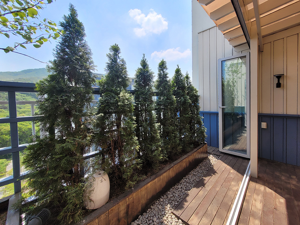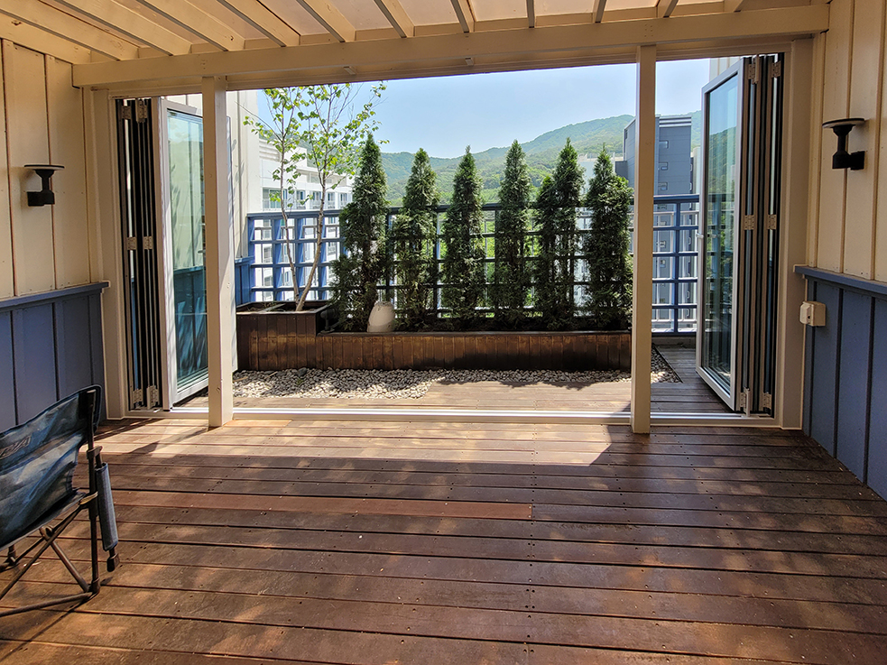 폴딩도어를 통해 도심 속 야외 테라스가 예쁘게 완성되었고, 날씨가 좋은 날에는 도어를 열어 시원한 바람과 기분 좋은 햇살을 만끽할 수 있습니다. 비가 오는 날이나 추운 겨울에는 폴딩도어를 닫아 따뜻하고 아늑한 공간으로 변신, 사계절 내내 테라스를 쾌적하게 사용할 수 있게 되었습니다. 이런 유연한 공간 활용 덕분에 테라스가 더욱 즐거운 휴식처로 변하게 되었습니다.