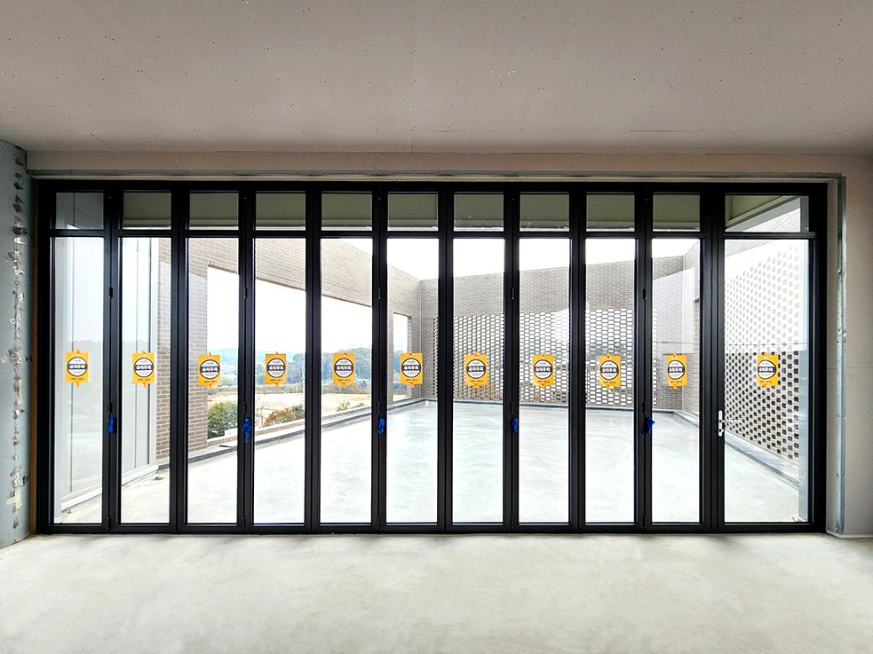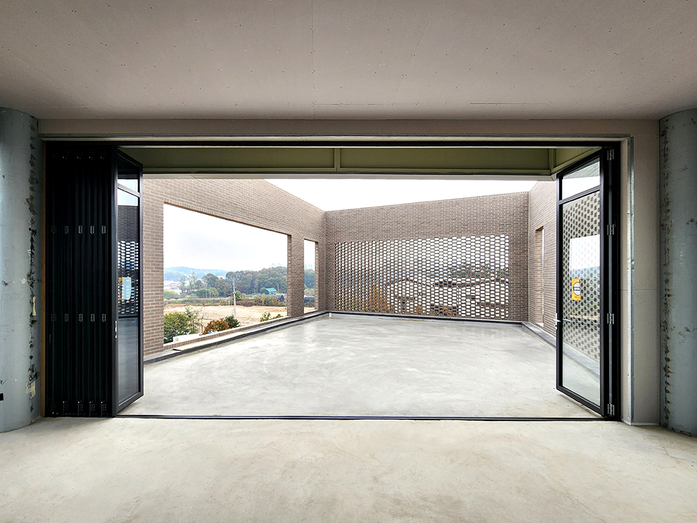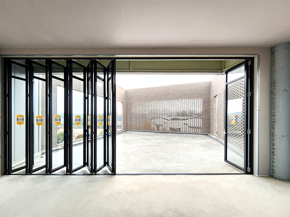 신축현장의 건물 옥상층에 폴젠코리아의 단열폴딩도어와 경첩도어를 설치하였습니다.
