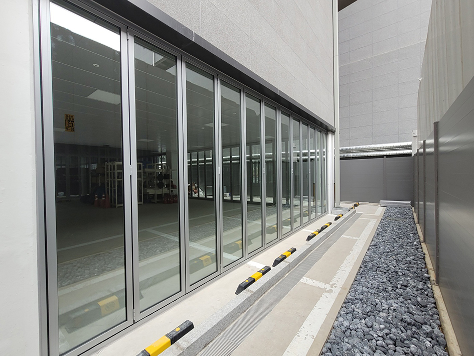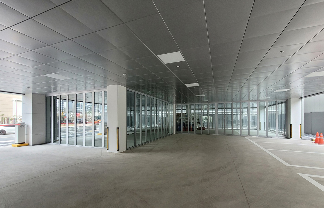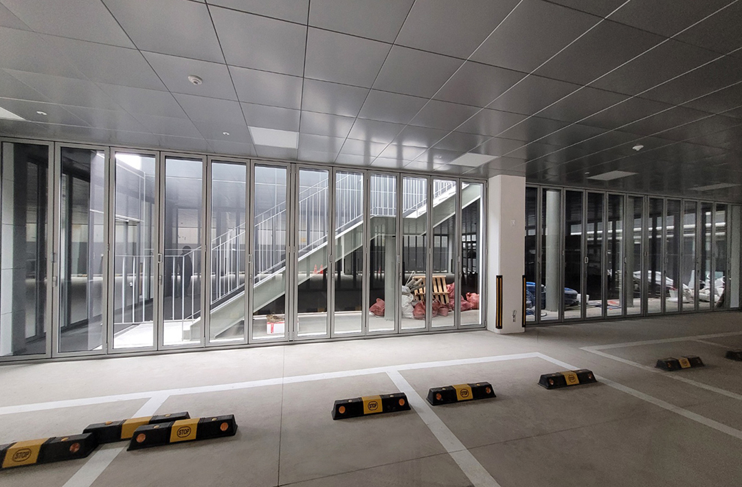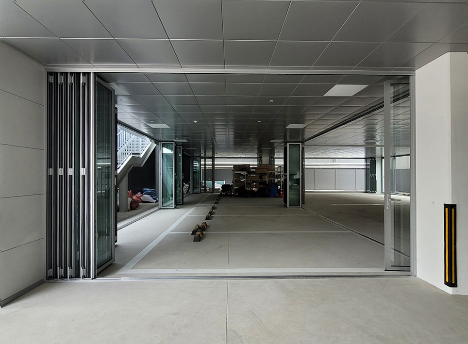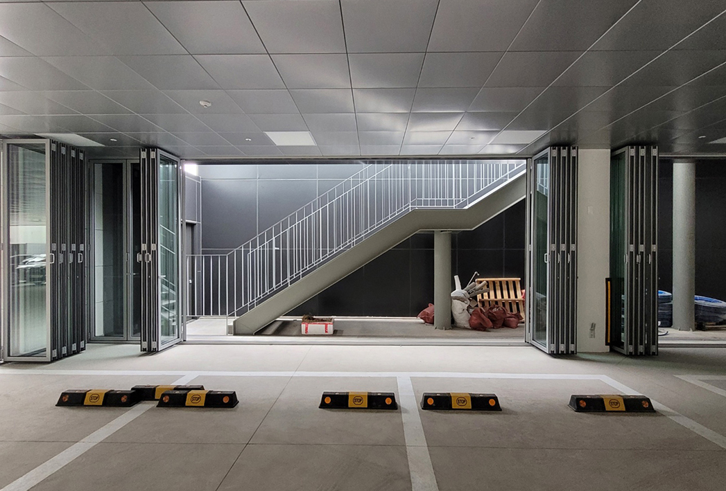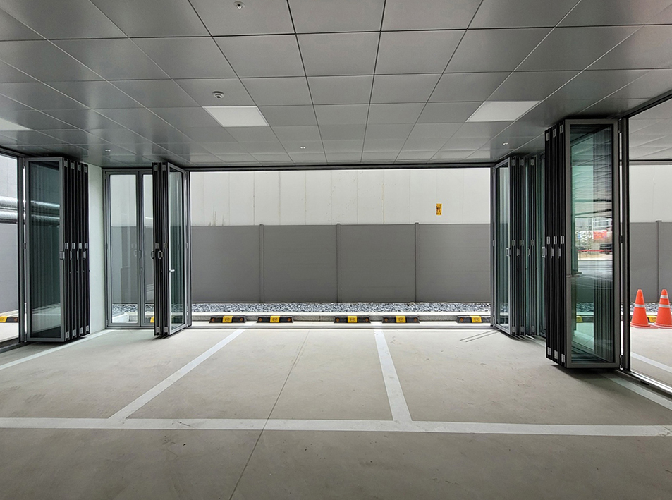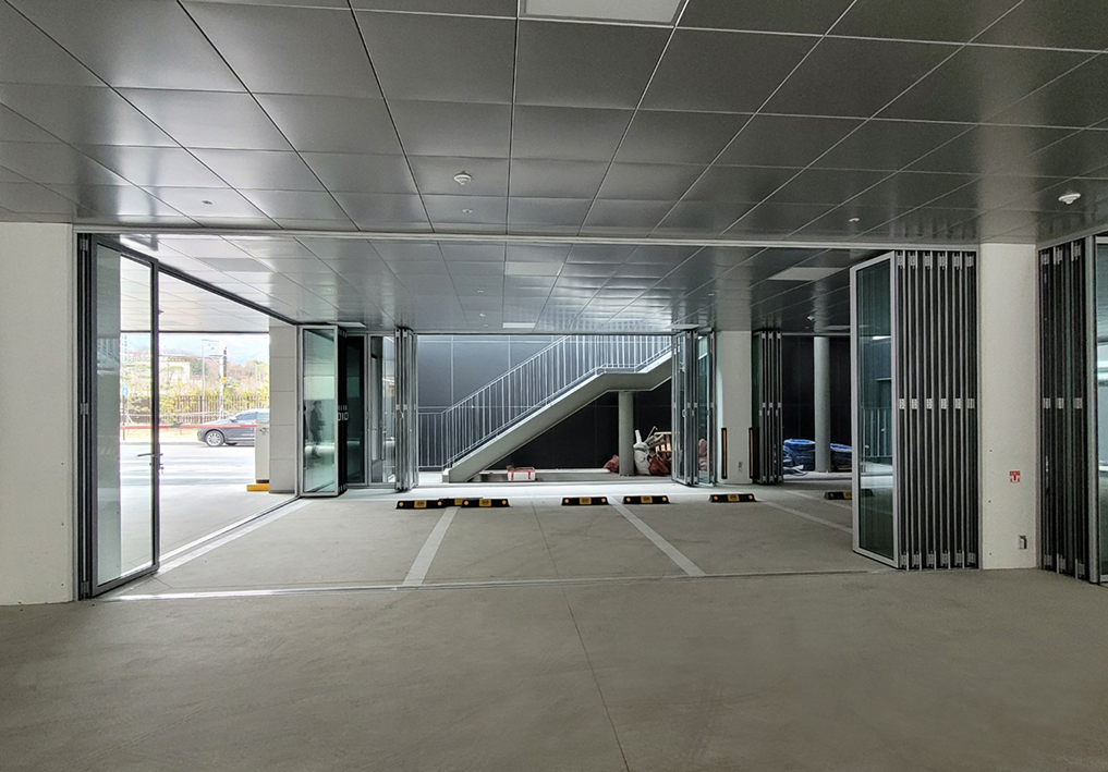 ▷ 고양 지축2로 21 ◁ 경기도 고양시 덕양구 지축 2로 21에 위치한 역세권 주차타워 상가입니다. 위치에 따라 일반형 레일과 차량이 지나가는 곳은 카센터형 레일을 설치하여 총 8틀 92장의 폴딩도어를 설치하였습니다. 실버컬러의 폴딩도어가 깔끔하고 세련된 느낌이 있어 주차타워 내부와 잘 어울립니다.