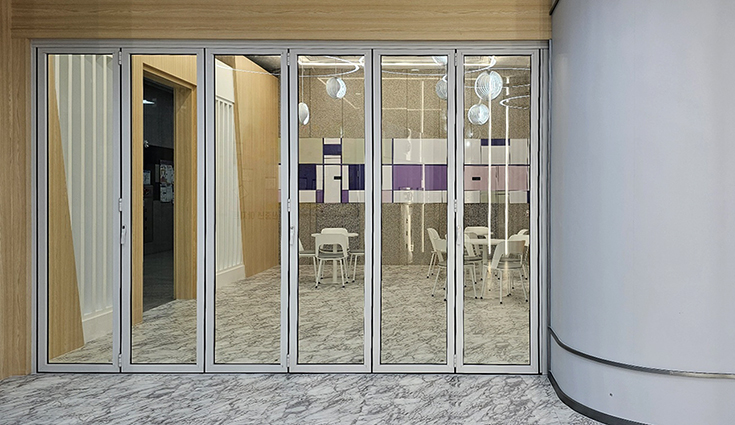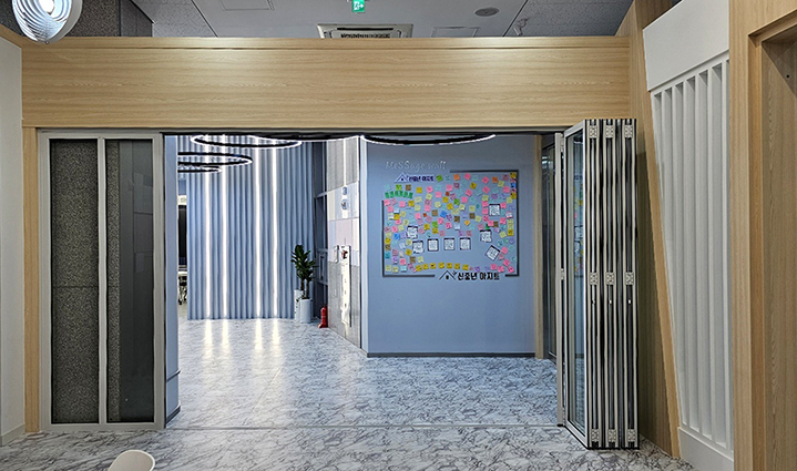 건물 3층에 위치하고 있는 신중년 아지트 3층 로비와 휴게실 사이에 화이트컬러 폴딩도어 6장을 설치하였습니다.