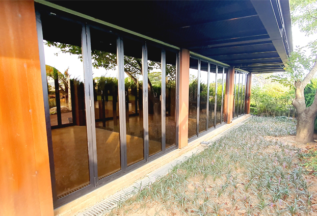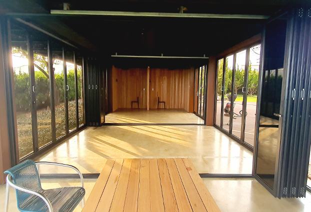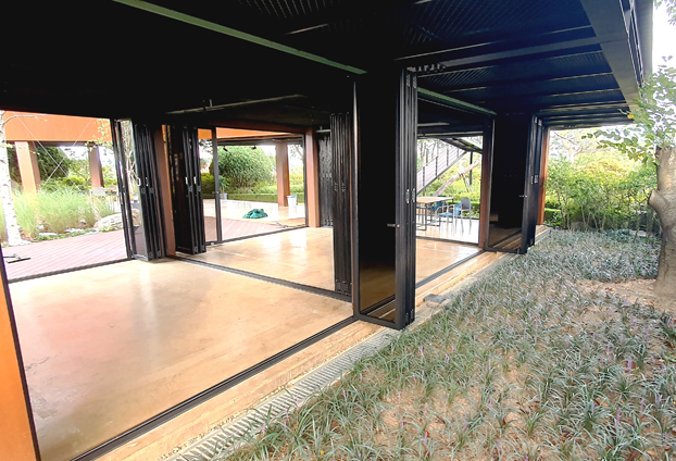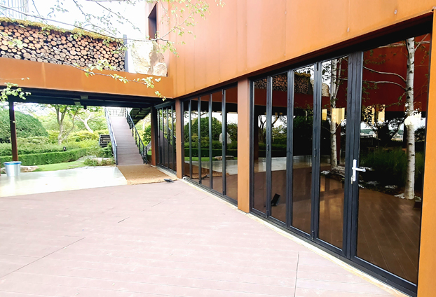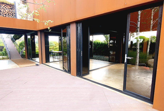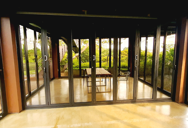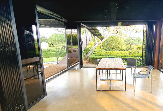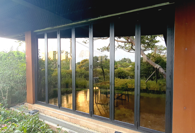 ▷ 영흥도 섬꾸지 카페 ◁ 오렌지색상과 우드톤의 인테리어가 인상적인 카페입니다. 1, 2층의 모든 창을 블랙 색상의 폴딩도어와 브론즈 색상의 유리로 선택, 시공하였습니다. 블랙 폴딩도어와 브론즈의 색상의 유리가 카페 인테리어와도 잘 어울어져 세련되고 아늑한 분위기가 느껴집니다.