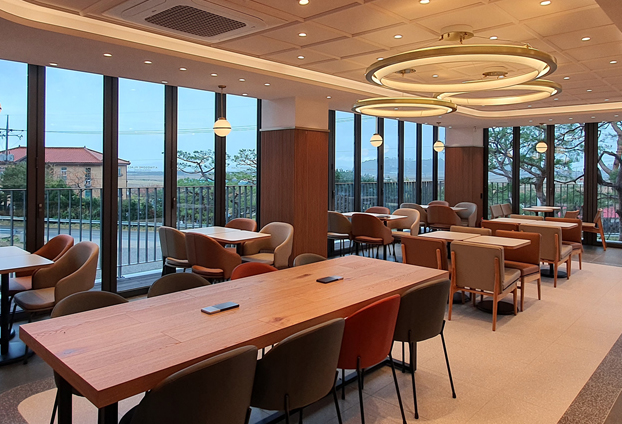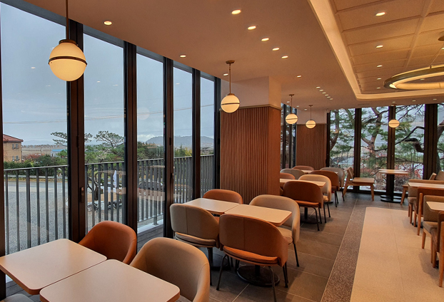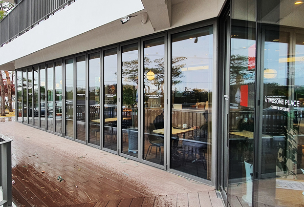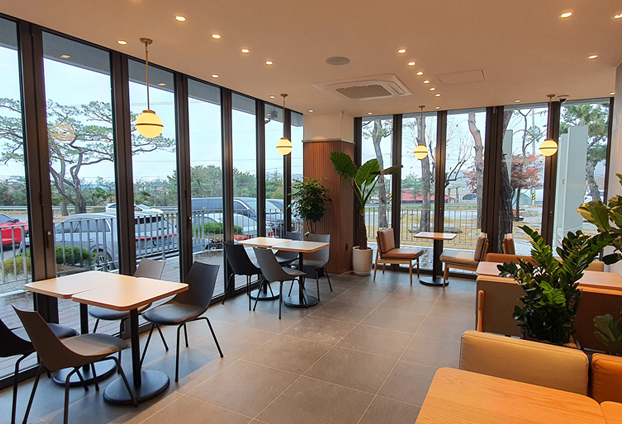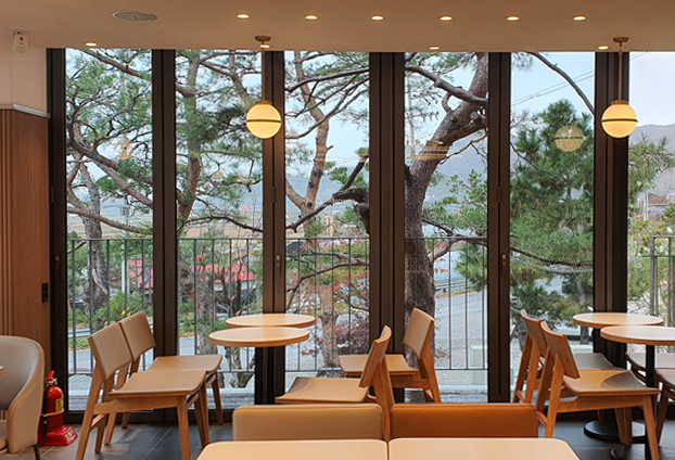 많은 분들이 좋아하시고 방문하시는 투썸플레이스 카페입니다. 총 2층 건물로 지어졌으며 1~2층 외벽 창호를 모두 폴딩도어를 설치하여 전망 좋은 위치에 자리 잡은 카페의 장점을 크게 부각 시켰습니다. 1층과 2층 전면이 폴딩도어로 시공되어 어떤 공간에 앉더라도 아름다운 풍경을 바라보며 커피를 마실 수 있습니다.