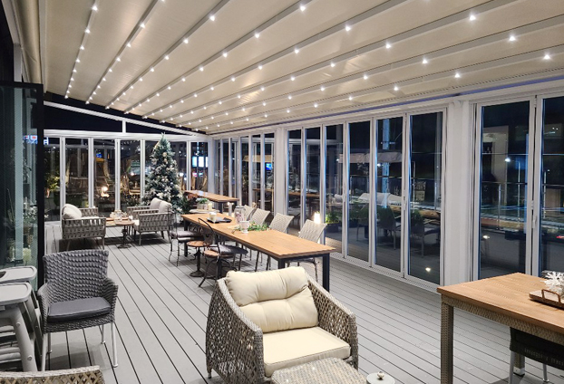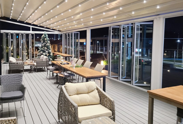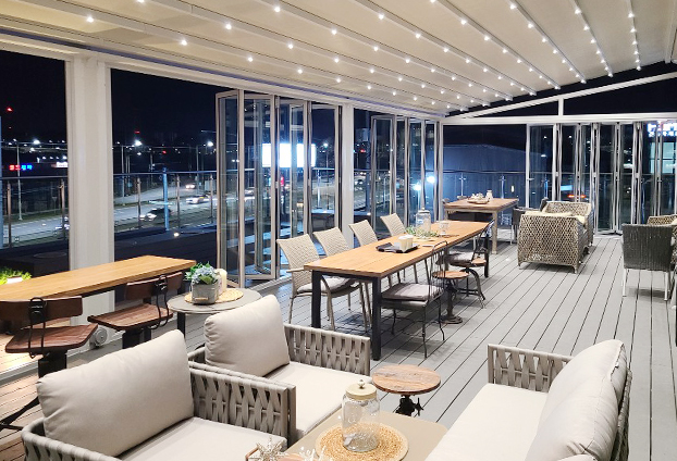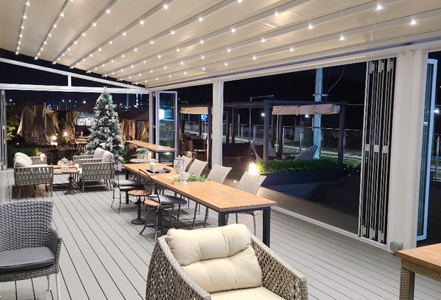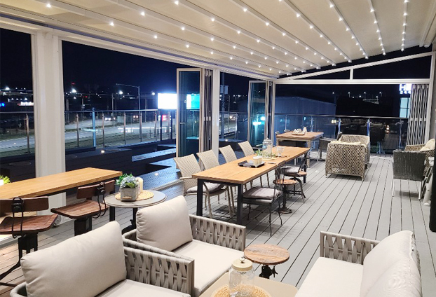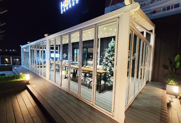 전면이 화이트 컬러의 폴딩도어로 설치되어 카페 내부가 세련된 분위기와 함께 더 밝고 넓어 보입니다. 날씨가 좋은 날에는 폴딩도어를 전면개방하여 야외 카페의 느낌을 느낄 수 있으며, 계절에 따라 폴딩도어를 조절하여 다양한 분위기 연출이 가능합니다.