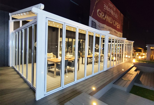 김포 홈데코 전시장 내에 위치한 카페에 화이트톤의 인테리어와 가구, 조명에 맞추어 화이트 색상의 폴딩도어를 설치하였습니다.