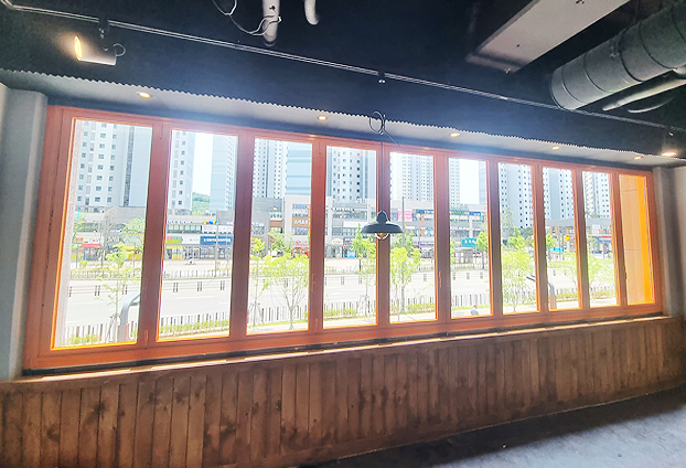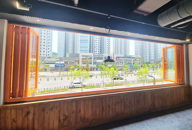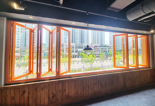 업종에 맞게 최상의 환경과 인테리어의 업그레이드를 위해 많은 장점을 가진 폴딩도어를 창문으로 설치를 하고 있습니다. 영업 종료 후 오랜 시간 창문과 문을 닫아놓게 되면 밀폐된 공간으로 내부의 공기가 탁하게 머물러 있기 때문에 2층에 위치해 있어도 열리지 않는 픽스유리창으로 빠른 환기에 어려움이 생깁니다. 이런 이유로 의뢰자님께서는 매장 내부를 좀더 쾌적한 공기로 유지를 하고자 넓은 개폐율을 보유한 폴딩도어로 매장 외부 창문을 교체시공 하셨습니다.