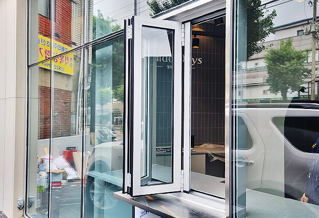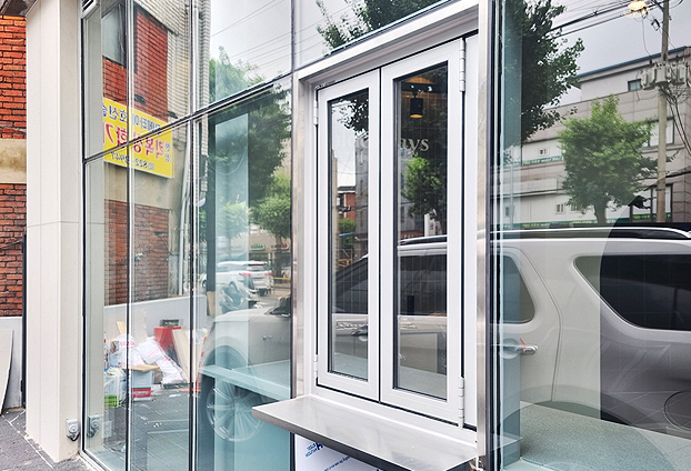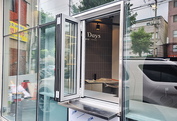 코로나19의 영향으로 테이크아웃 주문량 더욱 늘어 주문하시는 많은 분들께서 매장 안으로 출입하여 주문하고 대기하시면 그만큼 매장 내부 안이 복잡해지는 점과 매장 안에서 손님들에게 불편함을 전달하게 됩니다. 이러한 점을 완화하기 위해 창문형 폴딩도어를 설치하여 매장에 방문하시는 고객님들께서 구지 매장안으로 들어오지 않아도 외부에서 구매가 가능 할 수 있게 하여 실내 안이 복잡하지 않을뿐더러 방문하신 손님에게 빠르게 전달 할 수 있게 하였습니다.