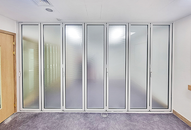 폴딩도어 유리로는 투명 + 투명 복층유리가 가장 많이 제작되고 있지만, 프라이버시한 공간으로 어느정도의 가림정도가 필요할때는 이번 제작된 폴딩도어와 같이 아쿠아 유리 또는 미스크 유리 등으로 반투명 효과를 주어 불투명의 답답함은 줄이고, 투명하게 보이는 내부는 차단하여 프라이버시한 공간으로 분리가 가능합니다.