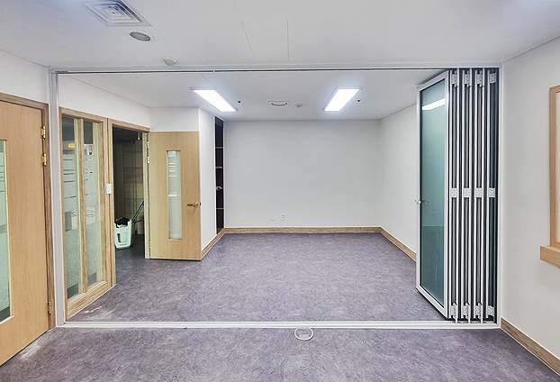 각 부서에 맞게 공간을 나눠서 사무업무 등 근무를 진행합니다. 그 나눠진 공간안에 추가로 폴딩도어를 설치하여 상황에 맞게 공간을 더욱 다양하게 활용 할수 있도록 하였습니다. 폴딩도어의 탁월한 공간활용도와 많은 기능성에 불투명하고 딱딱한 칸막이 대신 유리로 제작되는 폴딩도어를 설치하여 더욱 밝은 공간으로 자유롭게 확장과 분리를 하며 공간 활용도를 충분히 높일수 있습니다.