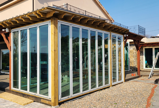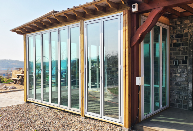 원목 소재 지어지는 개인 주택으로 원목의 느낌과 깔끔하게 조화를 이루는 화이트 색상의 폴딩도어로 제작하였으며, 3면에 폴딩도어를 설치하여 넓은 개폐가 가능한 다용도실로 꾸며졌습니다. 외부에 설치되는 점에서 24t로 두께감 있는 유리로 제작하여 단열 효과를 더욱 높여 외부 기온이 실내로 유입됨을 차단하였습니다.