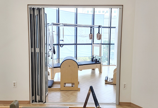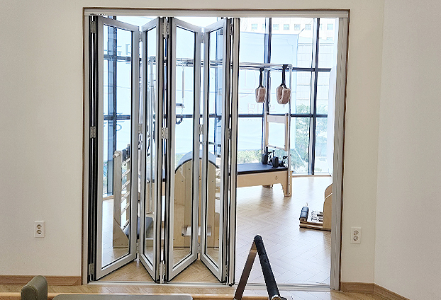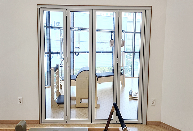 다양한 기구로 운동하는 수업 방식이 다른 필라테스 센터 입니다. 공간을 2개로 나누어 수업과 회원들을 관리하며 칸막이 폴딩도어 설치하였습니다. 칸막이 겸 폴딩도어를 설치하면 공간을 탄력적으로 운영할 수 있기 때문에 운동하는 희원분들과 강사진들 모두 순조로운 수업을 진행 할 수 있습니다.