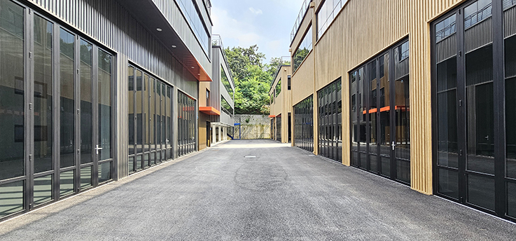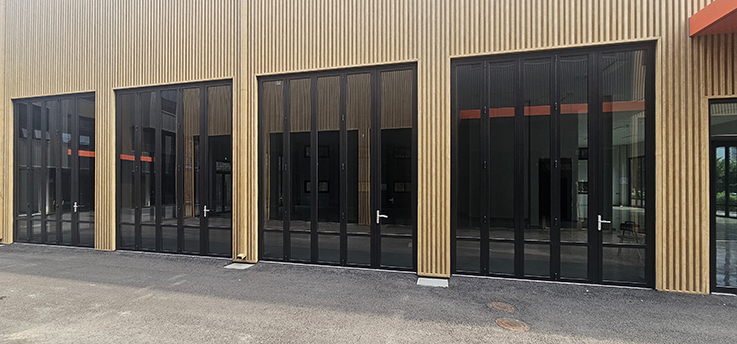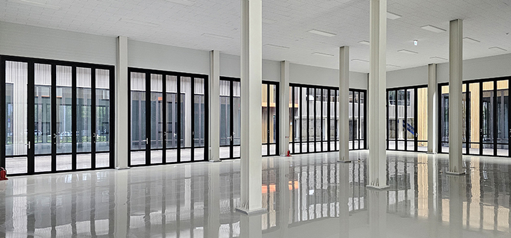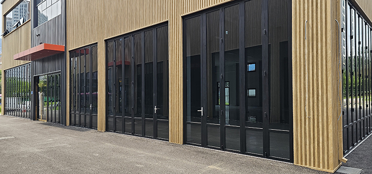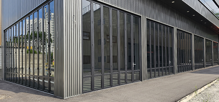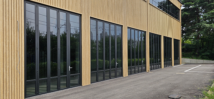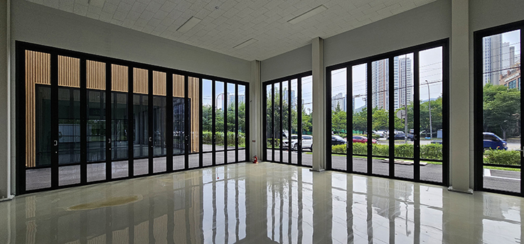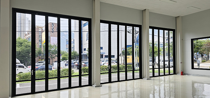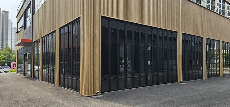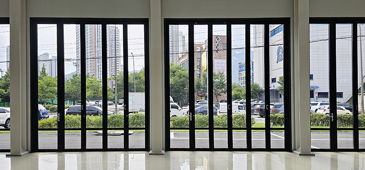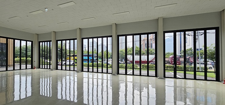 남양주 별내동에 위치한 신축 대형 물류센터에, 폴젠코리아의 폴딩도어가 시공되었습니다. 넓은 출입구 전면을 따라 시공된 폴딩도어는 대형 구조물에도 안정감 있게 설치되어, 공간의 규모감과 기능성을 동시에 완성했습니다. 설치된 폴딩도어는 고강도 알루미늄 프레임을 적용해 단단한 인상을 주며, 개폐 시에는 부드러운 슬라이딩 동작으로 물류 장비와 차량이 자유롭게 이동할 수 있는 넓은 개방폭을 확보합니다. 외관상으로도 건물 파사드와 조화를 이루는 슬림한 라인이 특징이며, 분할된 패널은 공간을 보다 정돈되고 모던하게 보이도록 설계되어 시공 후 전체적인 마감 완성도를 높였습니다. 내부에서 바라본 모습은 광폭의 출입구를 깔끔하게 접을 수 있는 구조로, 작업자의 동선과 물류 흐름을 방해하지 않으며, 필요 시에는 한 면 전체를 개방해 대형 차량 출입도 무리 없이 대응할 수 있습니다. 물류 흐름이 많은 현장일수록, 전면 개방이 가능한 폴딩도어는 최적의 선택이 될 수 있습니다.