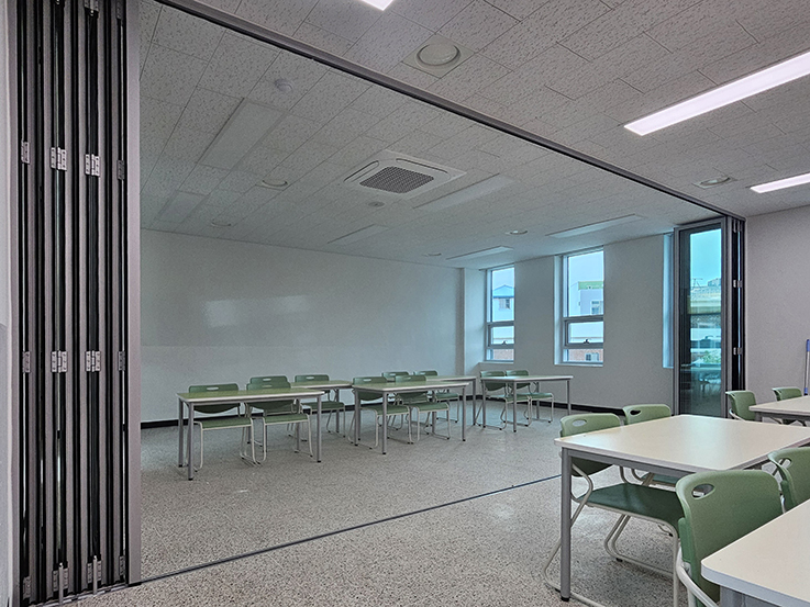 특히 강화유리 폴딩도어를 적용해 채광과 개방감을 유지하면서도 내구성을 높였으며, 낮은 단차의 하부레일 구조로 학생들의 이동 안전까지 고려하였습니다.