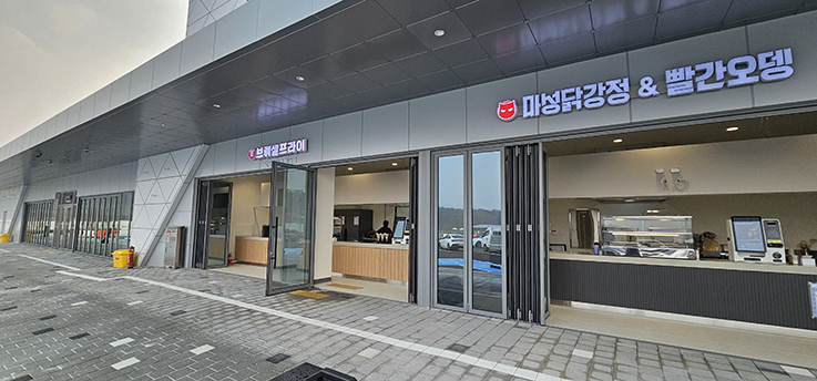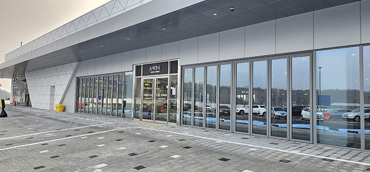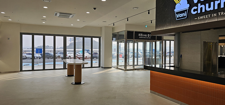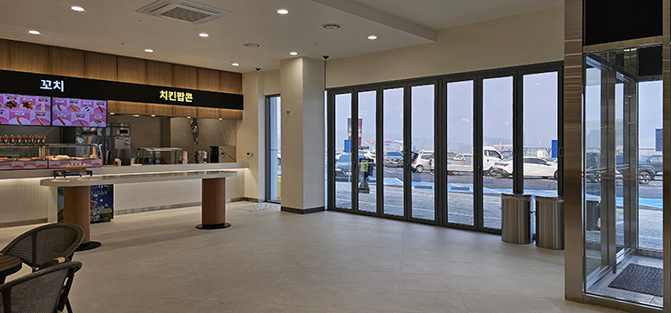 폴딩도어는 견고한 프레임과 부드러운 개폐 시스템을 적용하여 반복적인 사용에도 안정성을 유지하며, 휴게소 내부 디자인과 조화를 이루는 세련된 블랙 프레임을 사용했습니다. 그 결과, 이용객은 보다 쾌적하고 편리하게 공간을 이용할 수 있게 되었고, 휴게소의 전문적이고 깔끔한 이미지도 강화되었습니다.