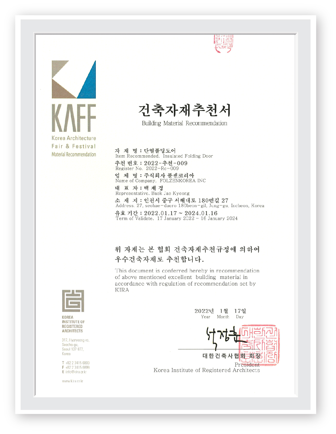 (주)폴젠코리아, 2022년 '대한건축사협회' 건축자재추천서 인증!