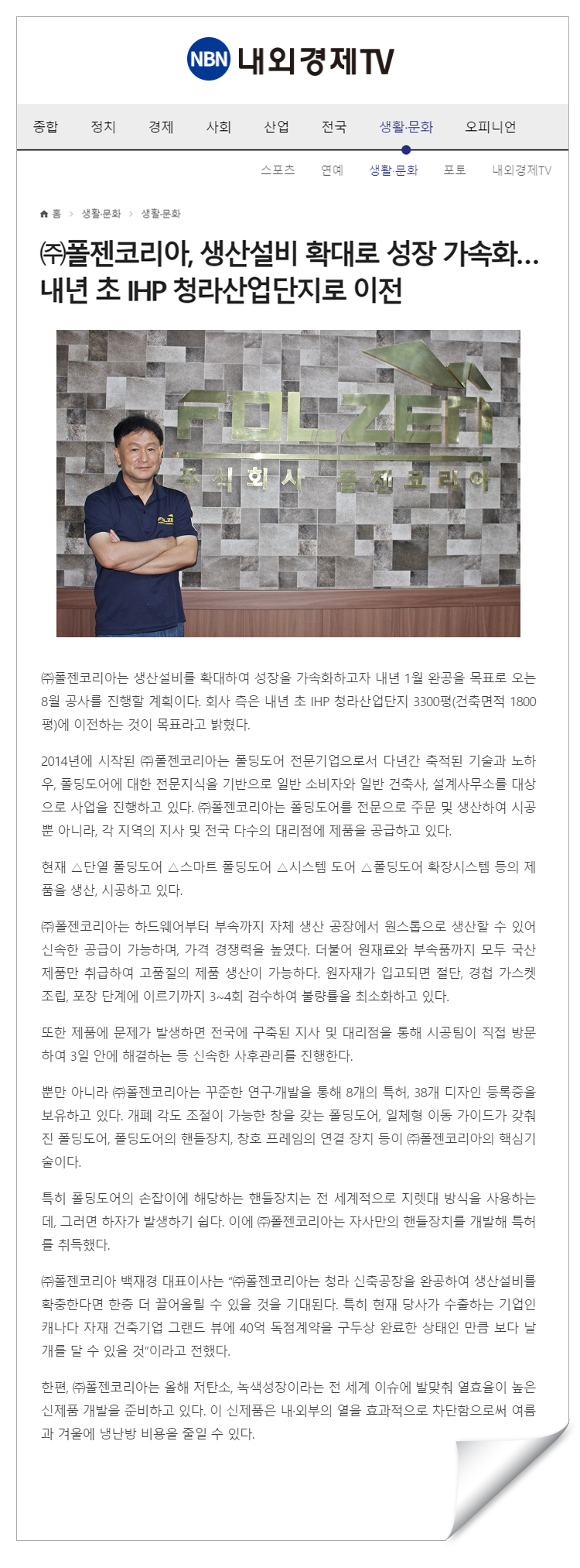 폴젠코리아 NBN 내외경제tv 생활/문화면_생산설비 확대로 성장 가속화 계획 기사 등재