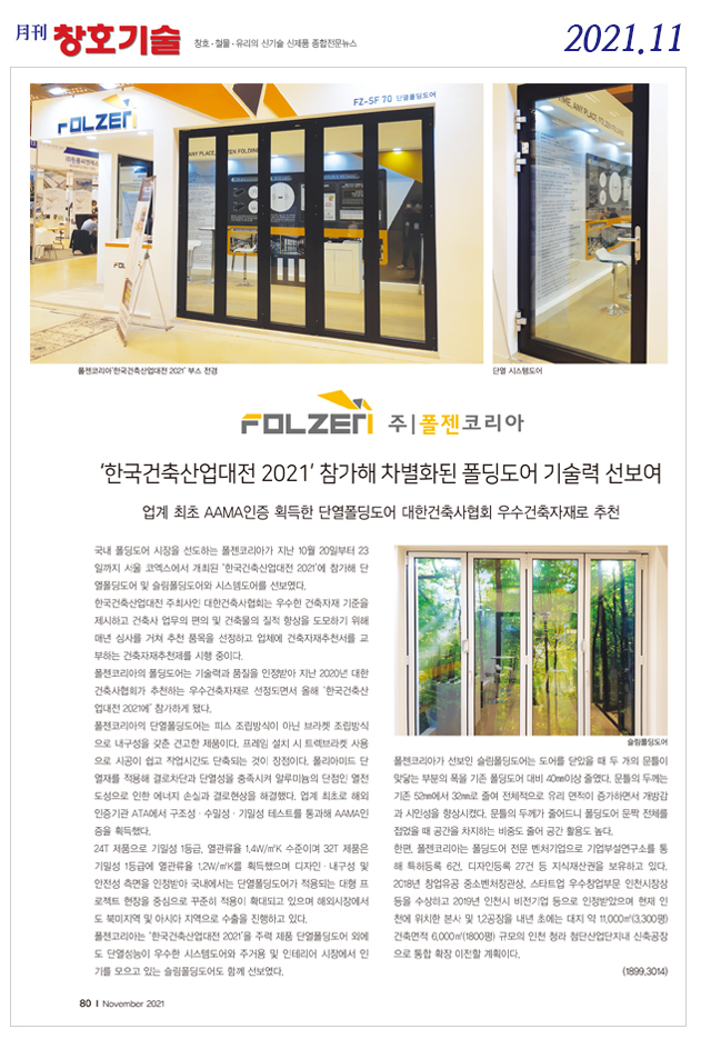 폴젠코리아 월간창호기술 2021년 11월호_한국건축산업대전 2021 참가 기사 등재