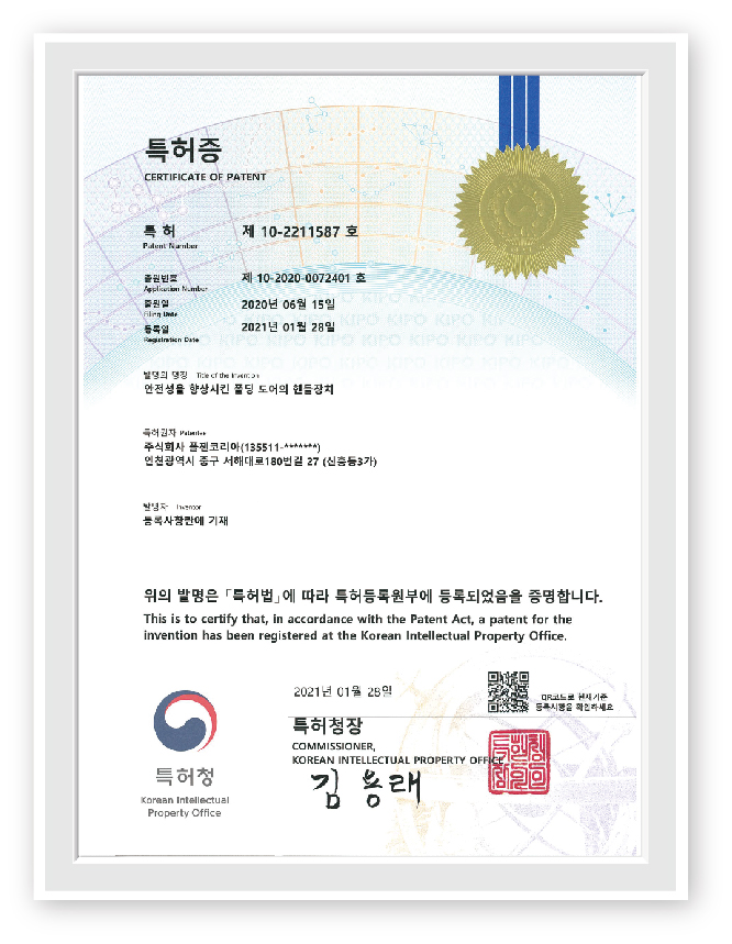 안전성을 향상 시킨 폴딩도어 핸들장치를 특허로써 인증 받았습니다.