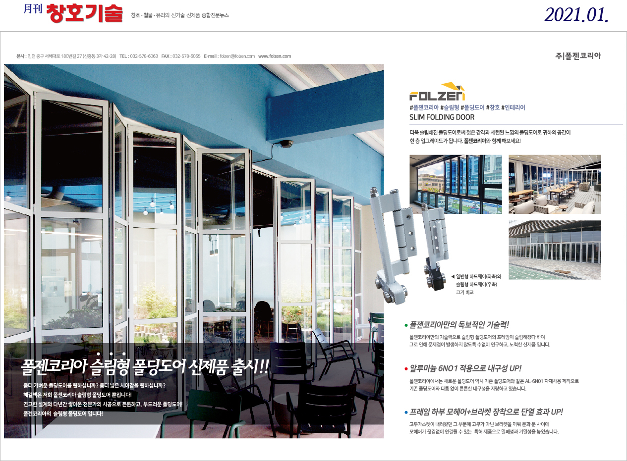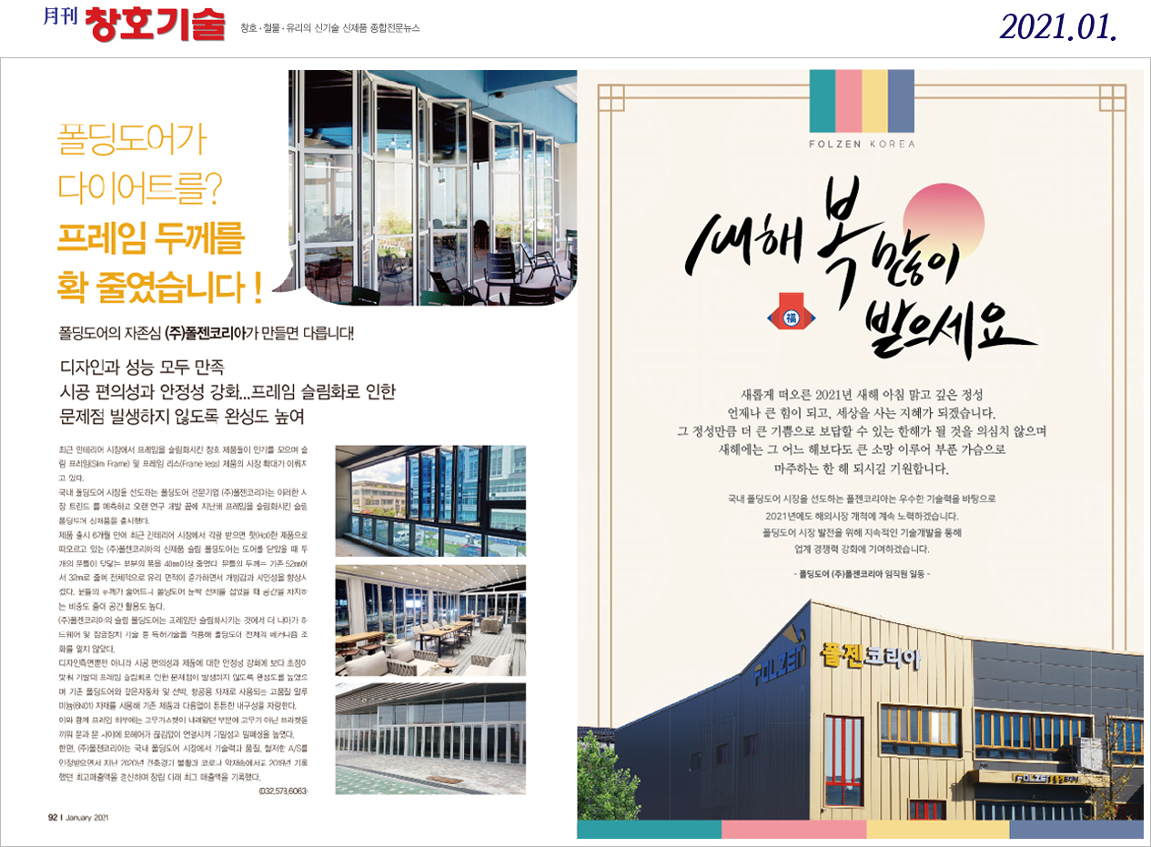 폴젠코리아 월간창호기술 2021년 1월호_슬림형 폴딩도어소식과 2021년 신년 인사 기사 등재