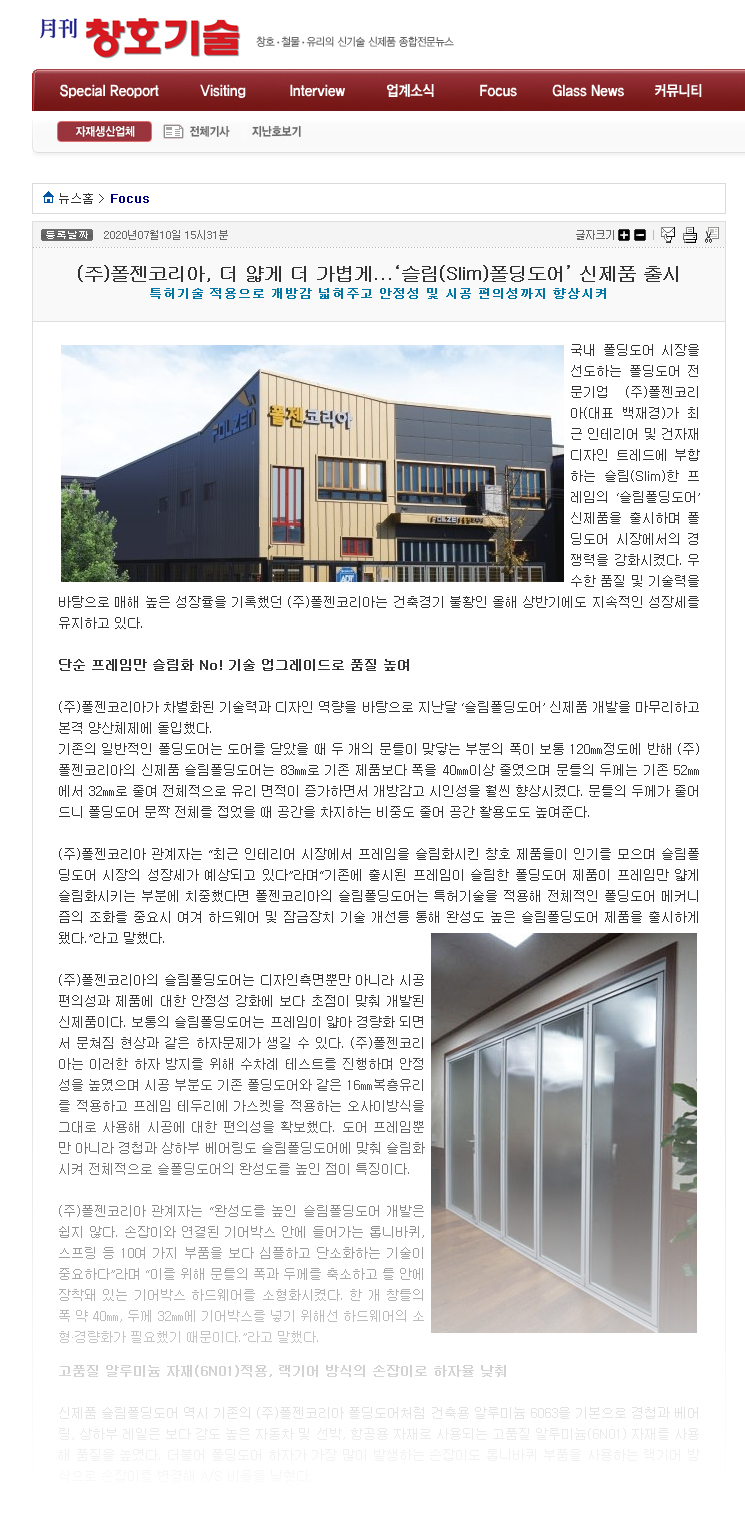 폴젠코리아 월간창호기술 2020년 7월호 _슬림형 폴딩도어 개발건 기사 등재