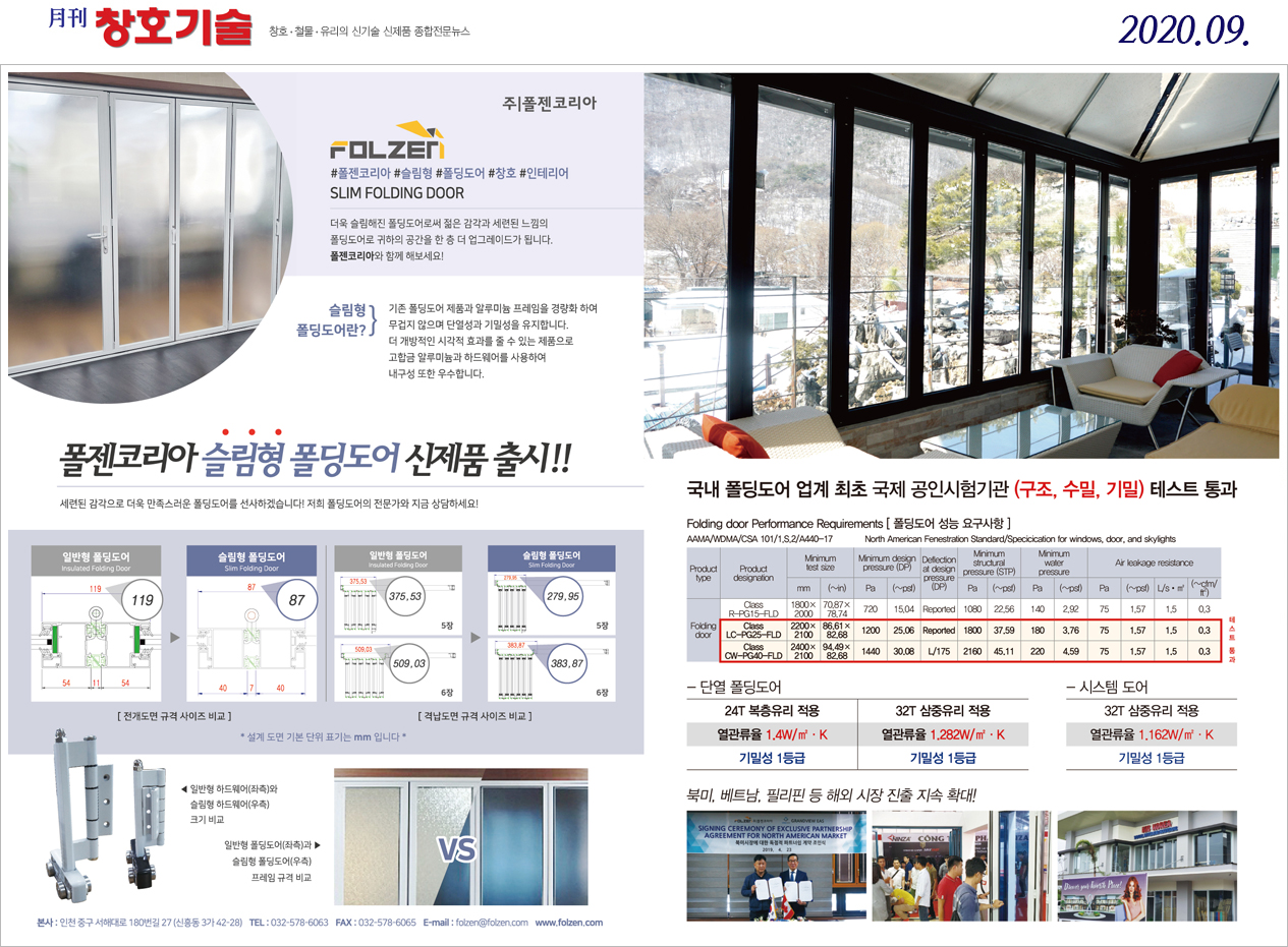 폴젠코리아 월간창호기술 2020년 9월호_ 슬림형 폴딩도어 출시 광고 등재