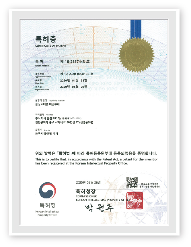 길고 길었던 기간을 묵묵히 기다림으로 이렇게 특허증을 수령하였습니다.