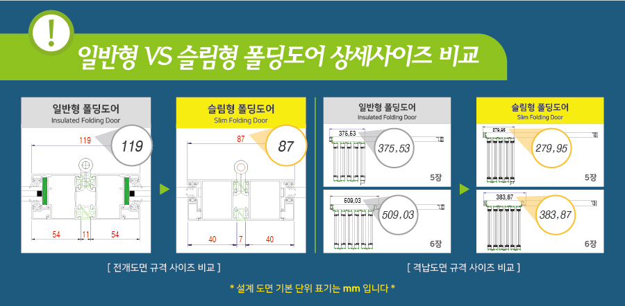 전개시 일반형 폴딩도어 프레임 119mm에서 슬림형 폴딩도어 프레임 87mm으로 32mm 축소 하였습니다.