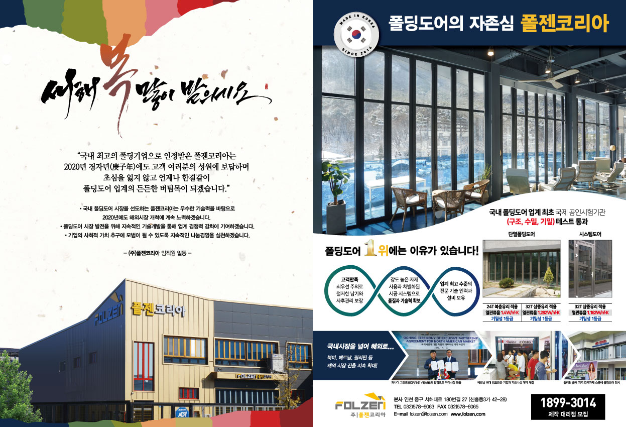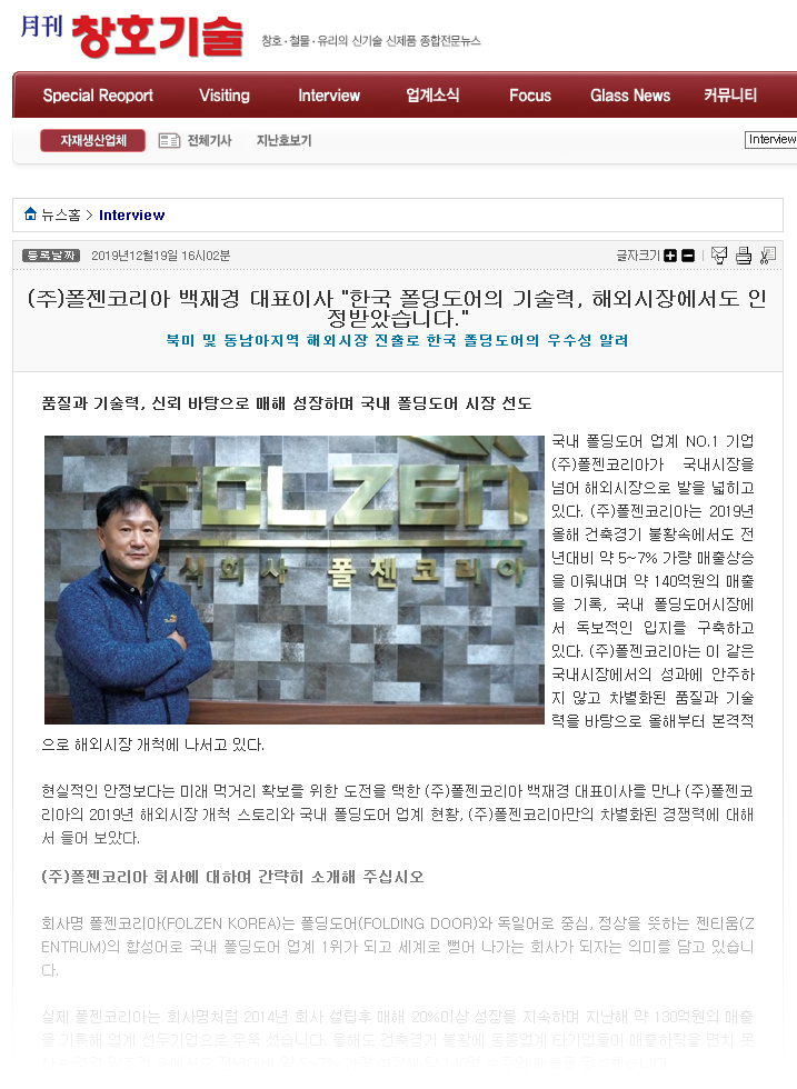 폴젠코리아 월간창호기술 2020년 1월호 _ 폴딩도어의 기술력 기사 등재
