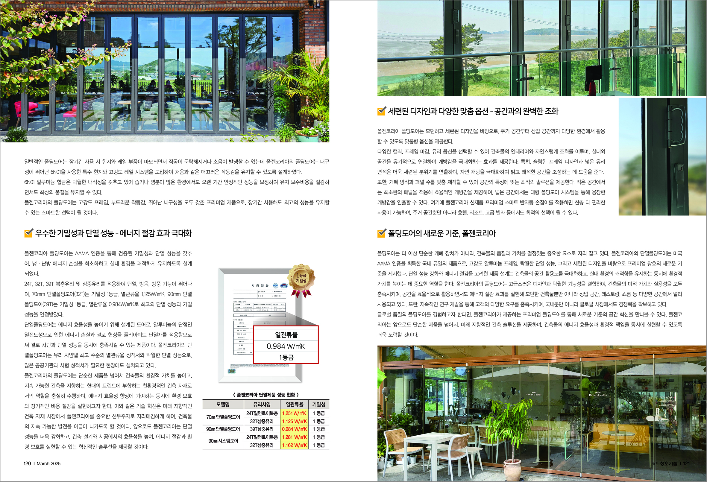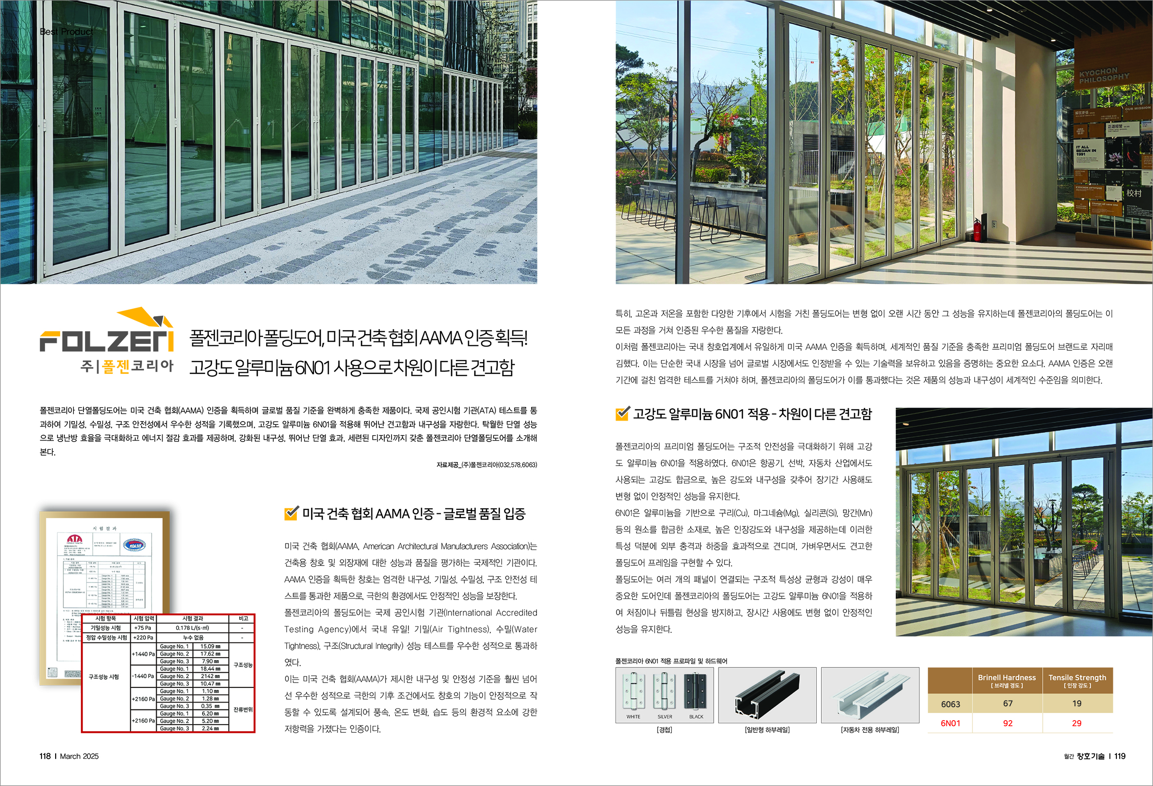 폴젠코리아, 월간 창호기술 4월호에 < 폴젠코리아 폴딩도어, 국내 유일! 미국 건축 협회 AAMA 인증 획득! > 기사 등재!