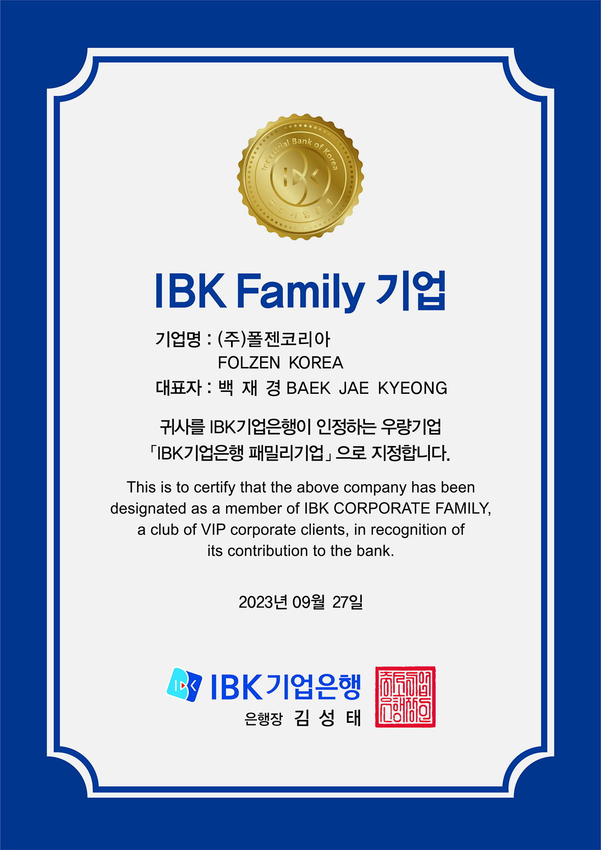 이번 IBK기업은행 패밀리기업 선정을 통해 회사의 성장 가능성과 경쟁력을 공식적으로 인정받게 돼 기쁘며