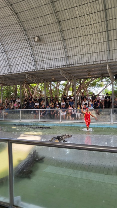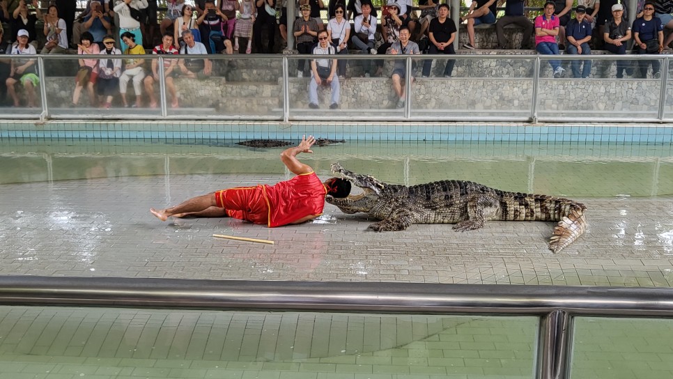 훈련된 악어이지만 공연을 보는 사람들은 아슬아슬하죠~